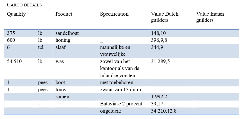 Product: slaaf. Kwantiteit: 6. Specificatie: mannelijke en vrouwelijke. De waarde van zes mensen komt overeen met ongeveer 240 kilo honing, zo’n 390 kilo sandelhout. Alle verhoudingen staan netjes genoteerd in het kasboekje.