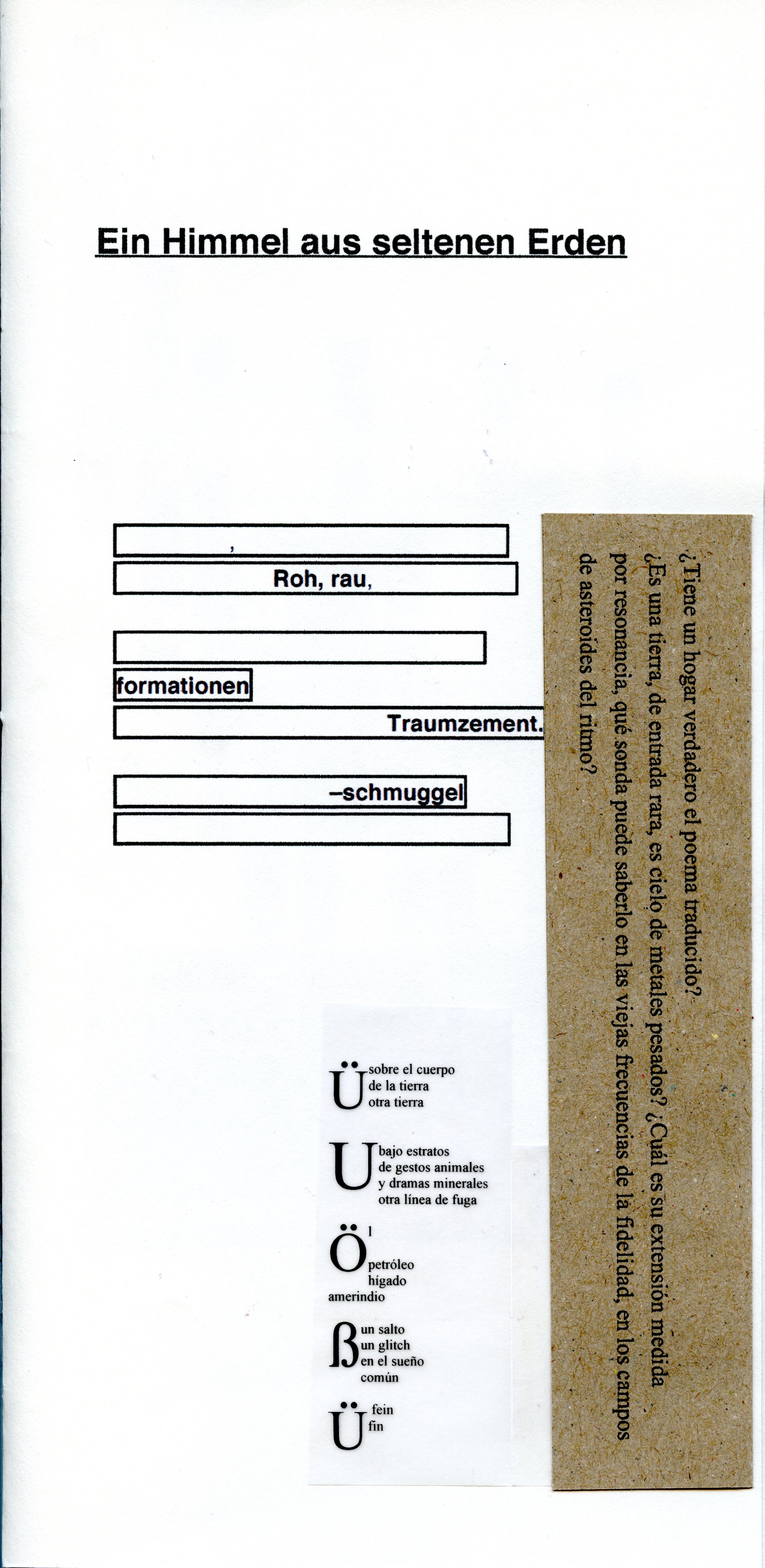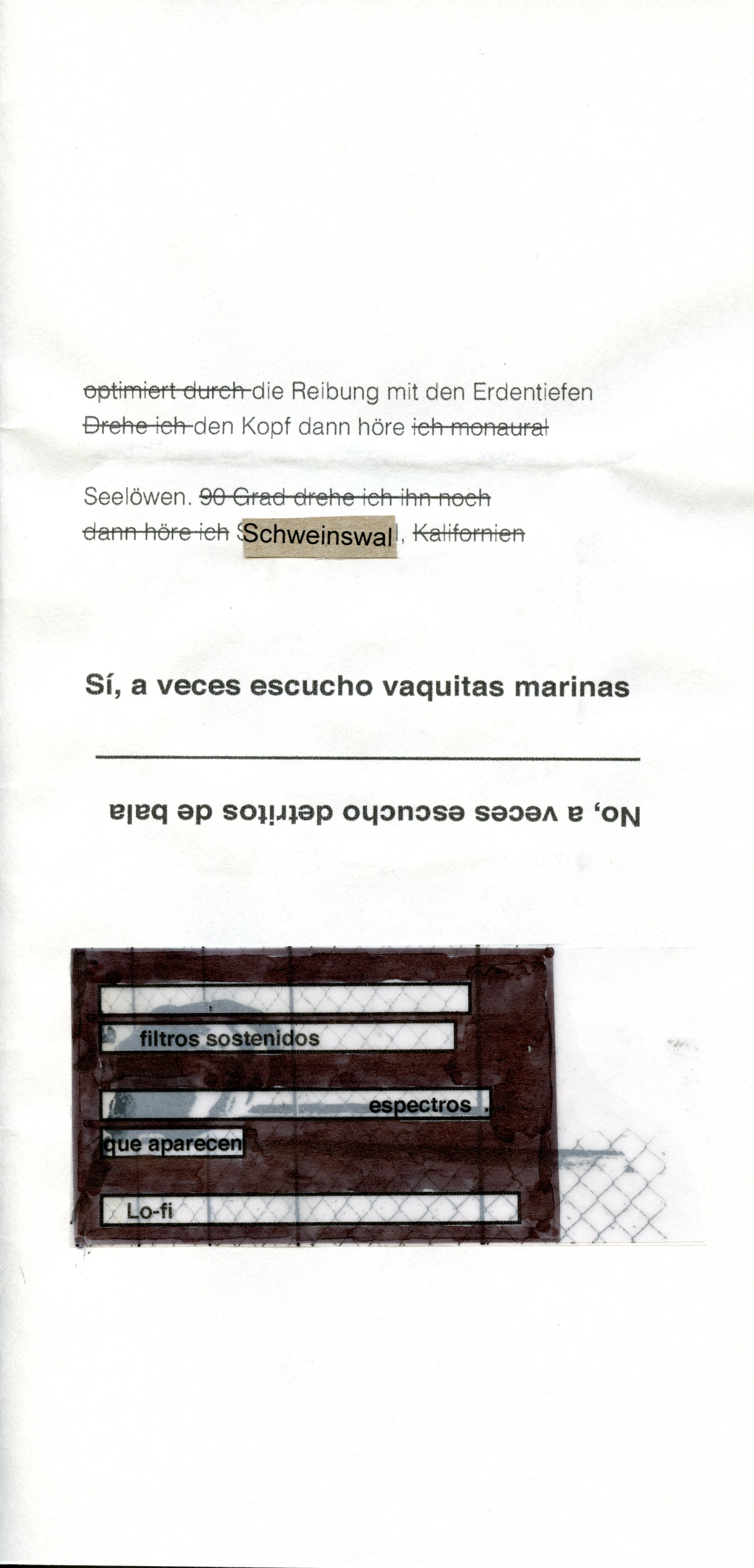 Si bien he vivido durante breves periodos de mi vida en Alemania y desde hace un par de años radico en el sur de tal país, no contemplo la posibilidad de escribir literariamente en lengua alemana, de la cual traduzco poesía desde hace más de una década. No obstante, al iniciar la primavera de 2021 ensayé un poema en alemán, quizá movido por el sol, por la lectura de Eichendorff y Werner Söllner, que me acompañaban esos días. Al madurar el verano y siguiendo la lectura de un ensayo sobre autotraducción de Irma Pineda, poeta mexicana de lenguas zapoteca y española, pensé en traducir aquel poema en alemán y reflejar gráficamente el proceso de convertir un texto propio en una versión propia, o impropia, pues la versión en español es en verdad y a todas luces mutante. El resultado cristalizó en Monoaural, un breve cuadernillo hecho a mano y en low-definition, que documenta este proceso y en el que los textos en alemán y en español, junto con las partículas gráficas, forman una unidad policéfala y, desde mi perspectiva, ya inseparable. Lo hice en el marco de un taller de libro de artista que ofreció Claudia de la Torre, artista mexicana, en Mannheim. Para ello utilicé imágenes propias, retazos de verso en alemán y en español y pasajes de un texto más amplio llamado «fragmentos sobre traducción y calabazas hokkaido». Aquí pueden leerse los poemas y, en la parte inferior, puede verse una digitalización de Monaural.